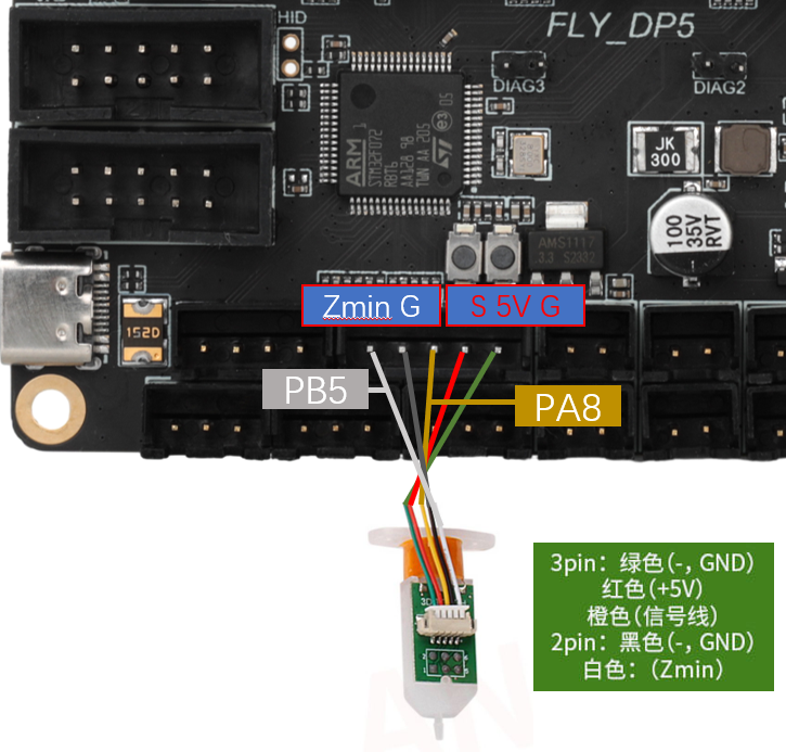 • Klicky为第三方的调平传感器,能够用极低的成本自己在家制作,且性能稳定,性价比高,推荐使用。接线方法如下图所示。