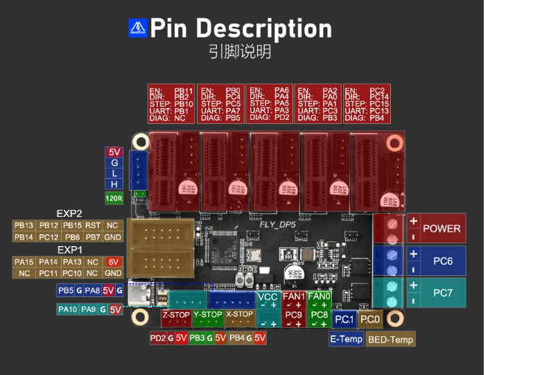 • 直流热床: 板载MOS接直流热床时请注意使用功率,直流热床最大电流不能超过10A。如果超过10A,建议使用外接MOS模块来使用热床,否则可能会对主板造成不可逆的损伤。