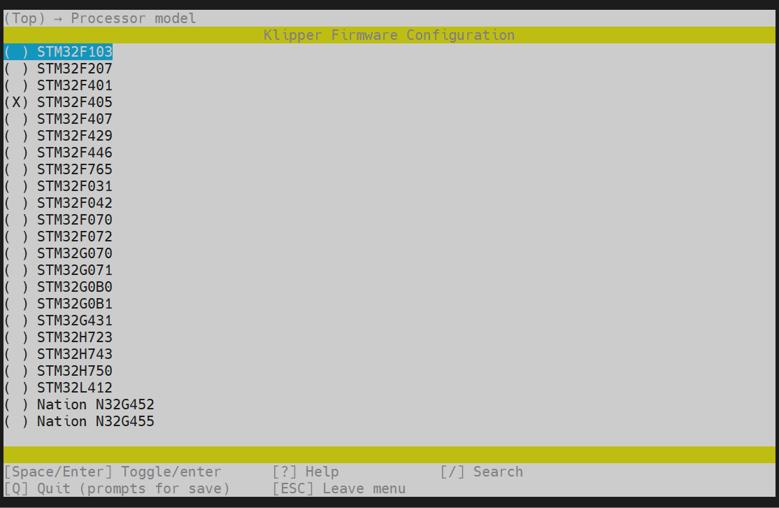 rm -rf ~/klipper/.config && rm -rf ~/klipper/out是删除之前编译数据与固件make menuconfig是编译固件,执行后应该出现下方界面