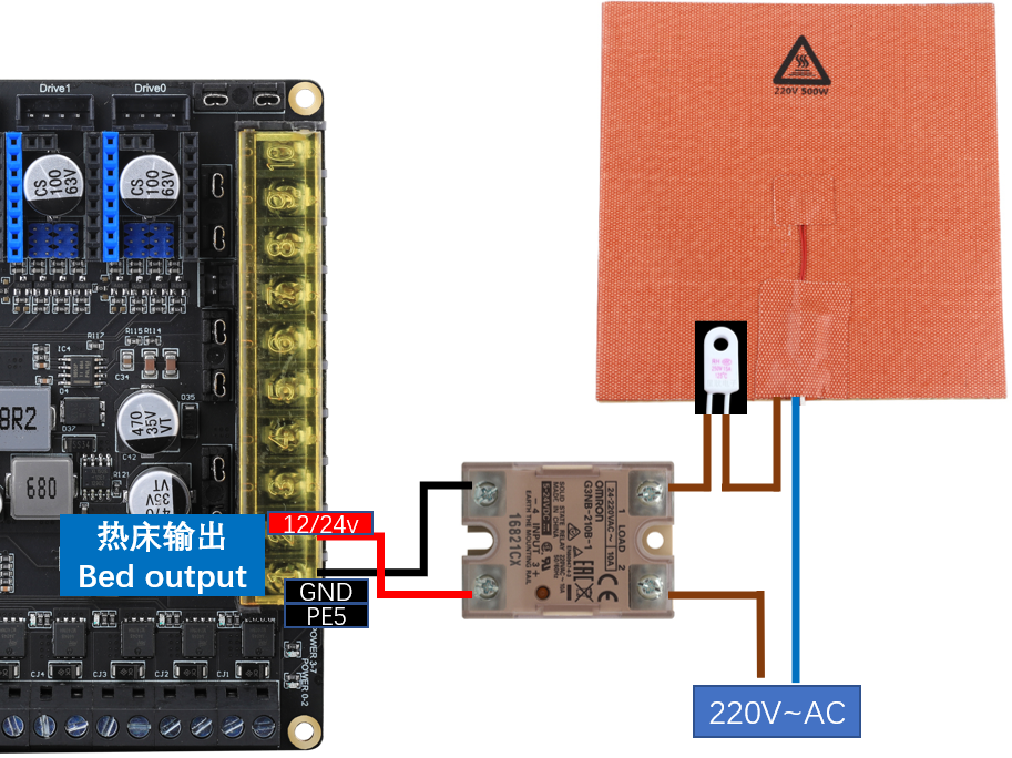 • 交流热床: 固态继电器在接线时,请注意输入和输出别接错了。