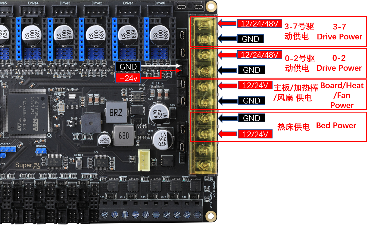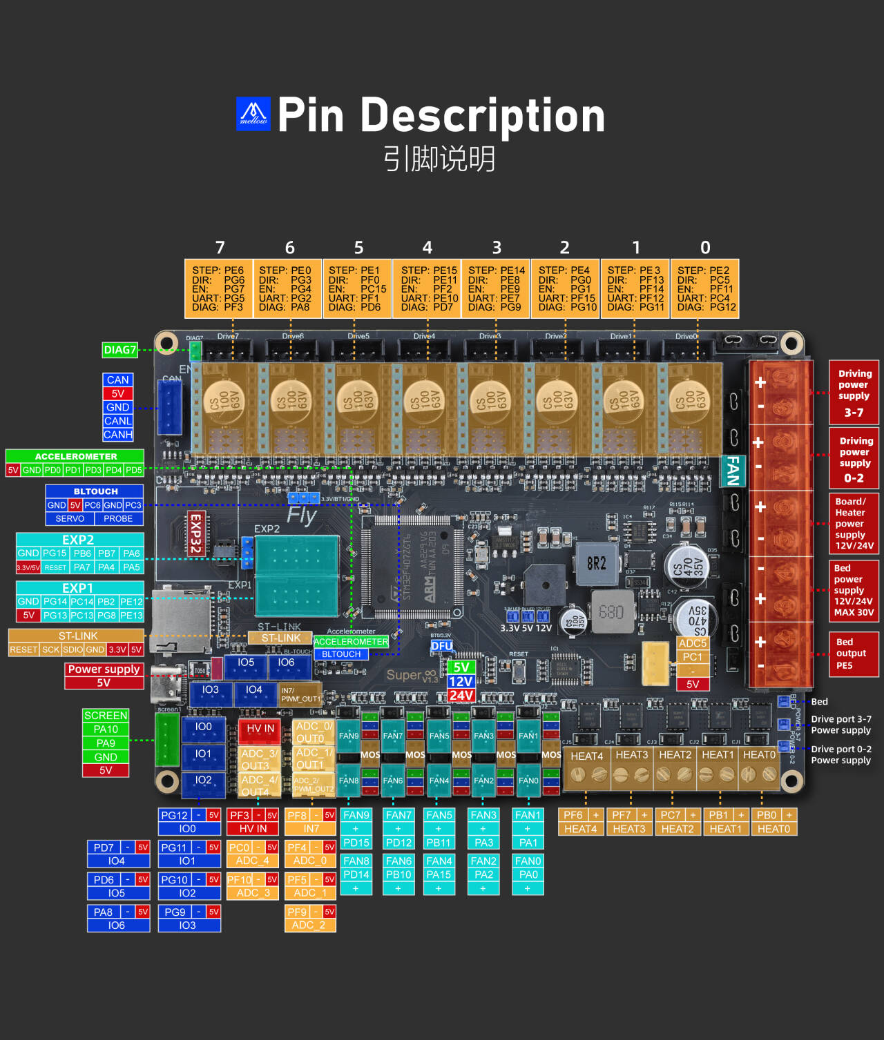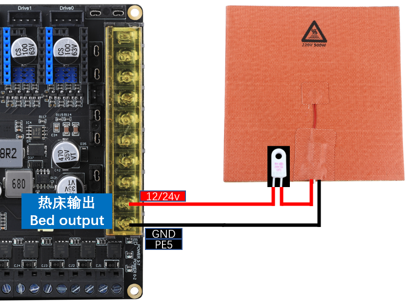 • 直流热床: 板载MOS接直流热床时请注意使用功率,直流热床最大电流不能超过10A。如果超过10A,建议使用外接MOS模块来使用热床,否则可能会对主板造成不可逆的损伤。
