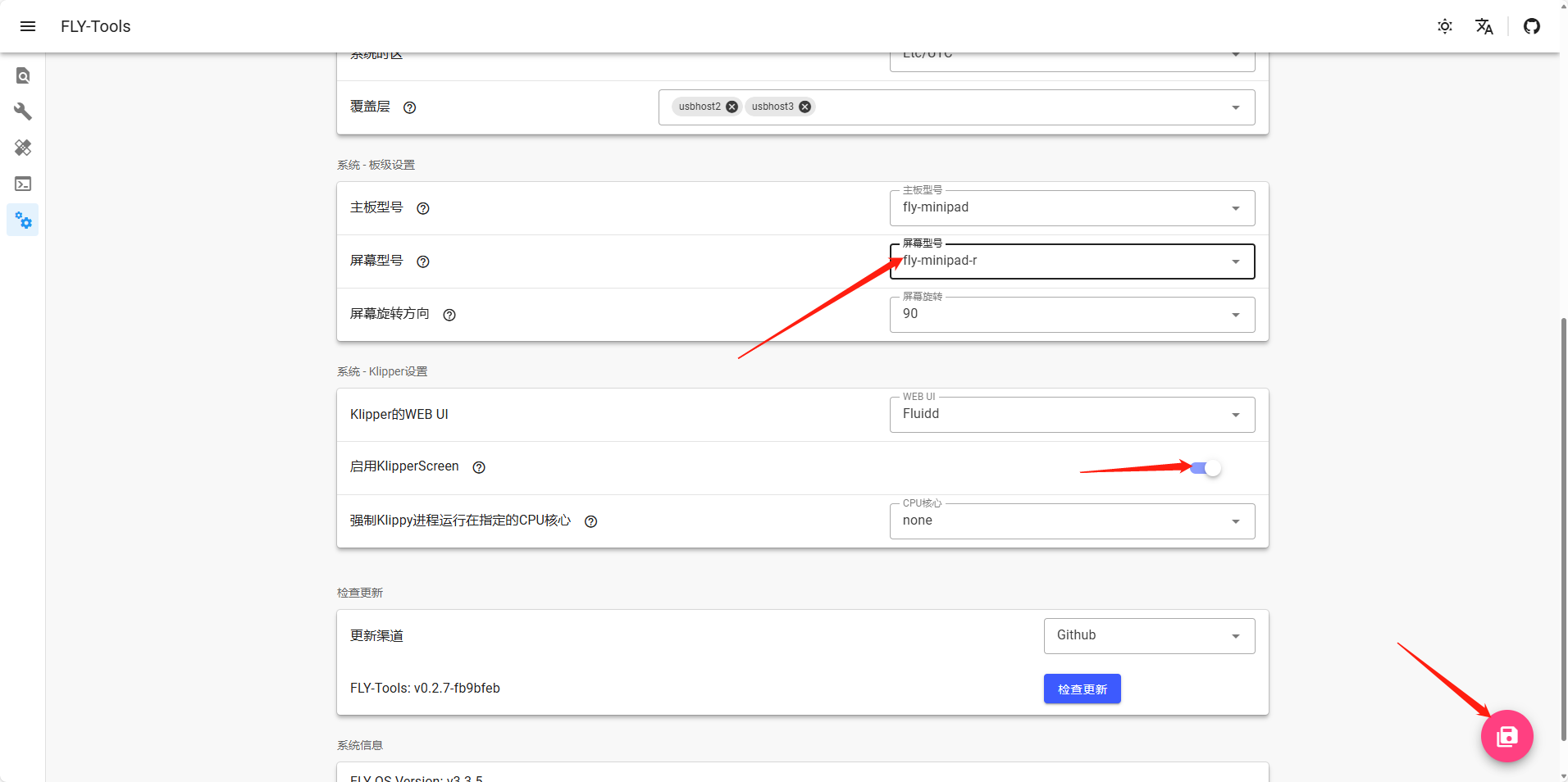 需要在FLY TOOLS中按下方配置屏幕并且打开KS