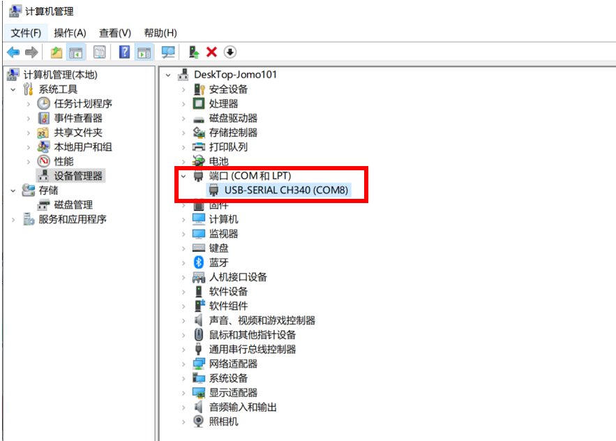 • 如果主板与电脑连接正常,打开设备管理器,就可以看到CH340的端口了