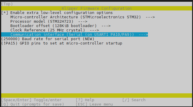 • 其中 rm -rf ~/klipper/.config && rm -rf ~/klipper/out是删除之前编译数据与固件make menuconfig是编译固件,执行后应该出现下方界面
