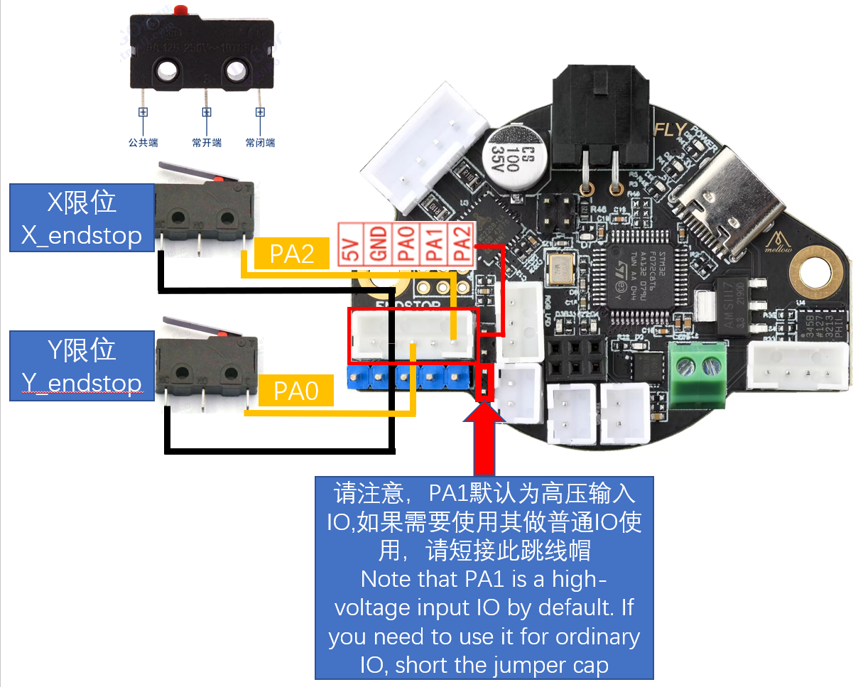 如果为VORON机型,可以考虑更换限位的安装位置,在打印头滑车上安装X限位开关,A电机座上安装Y限位开关。另外,在SHT36上,建议限位 开关前最好加上^,将信号上拉。例如: