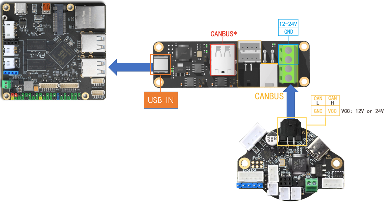 CANBUS: CAN接口,连接到扩展主板和工具板等(连接到有板载CAN收发芯片的设备)