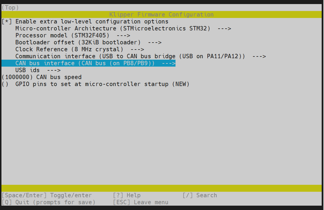 • 其中 rm -rf ~/klipper/.config && rm -rf ~/klipper/out是删除之前编译数据与固件make menuconfig是编译固件,执行后应该出现下方界面