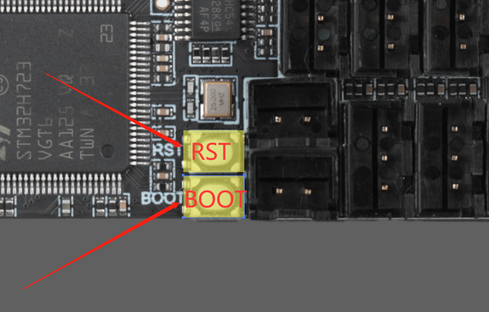 • 第一种:完全主板完全断电情况下,按着BOOT按键然后将带有数据传输的数据线一头接主板一头接上位机