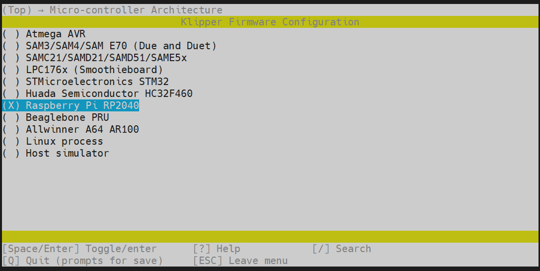 cd ~/klipper && rm -rf ~/klipper/.config && rm -rf ~/klipper/out && make menuconfig