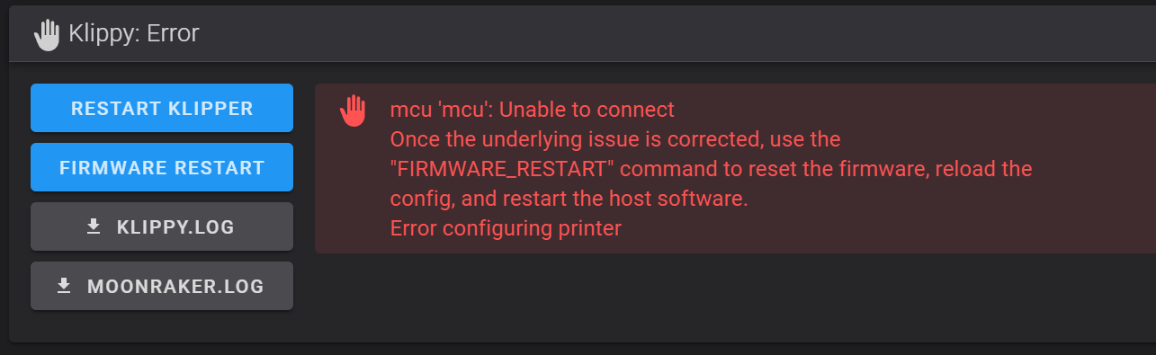 • 出现serialhdl.error: mcu 'xxx': Serial connection closed代表CAN ID没有找到或者填写错误,需要搜索ID并且填写进去