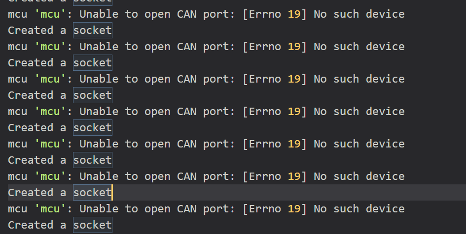 • 出现mcu 'mcu': Unable to open CAN port: Failed to transmit: [Errno 100] Network is down代表CAN网络没配置或者CAN0没启动