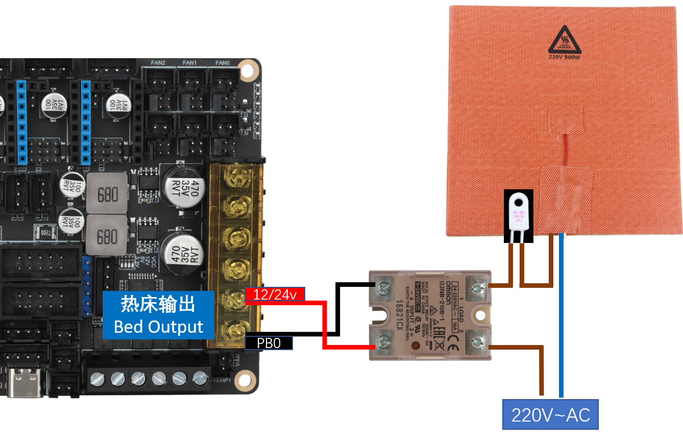 交流热床: 固态继电器在接线时,请注意输入和输出别接错了。