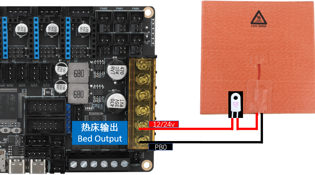 直流热床: 板载MOS接直流热床时请注意使用功率,直流热床最大电流不能超过10A。如果超过10A,建议使用外接MOS模块来使用热床,否则可能会对主板造成不可逆的损伤。