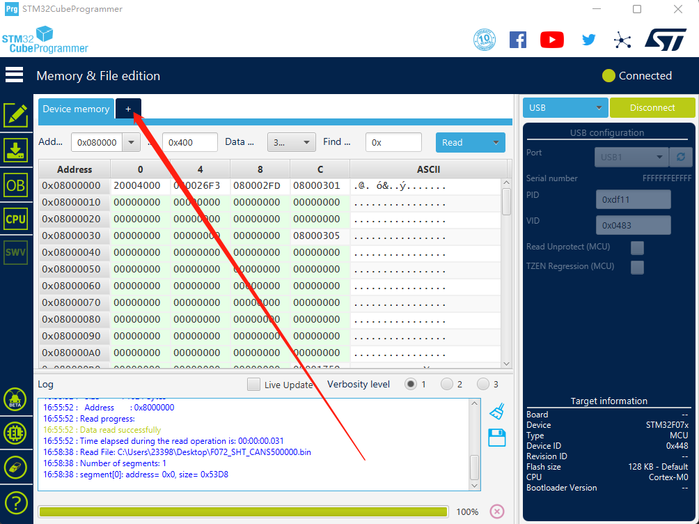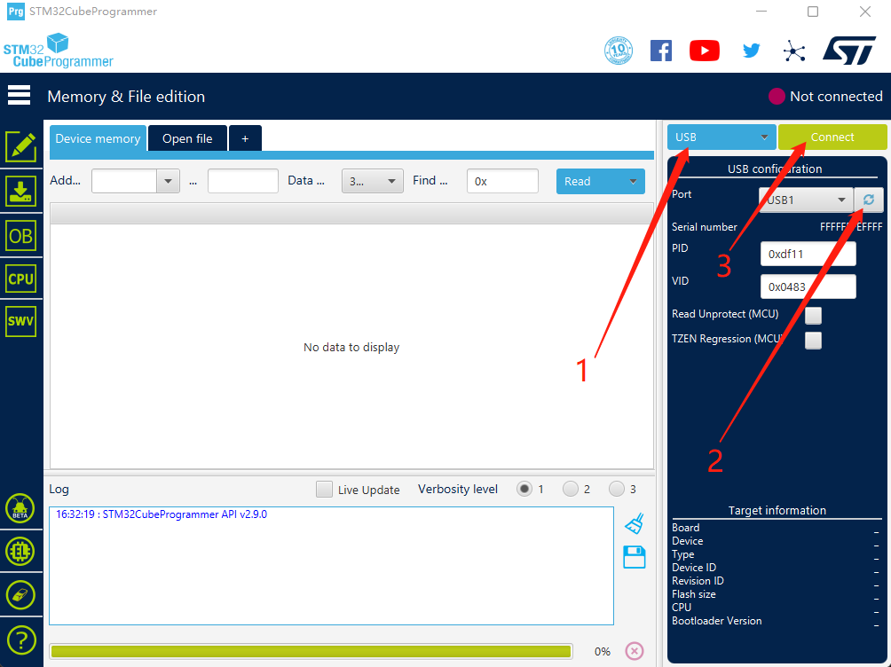 - STM32CubeProgrammer中选择USB模式,并刷新,连接