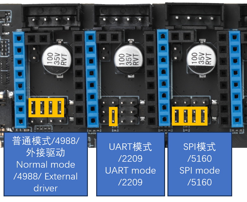 • STEP/DIR模式。 在这个模式下,通过使用跳线帽来设置细分,通过调节电位器来调整电流。最常见的是A4988驱动,使用这类驱动需要查询厂家提供的细分配置表,然后通过跳线帽来设置细分。