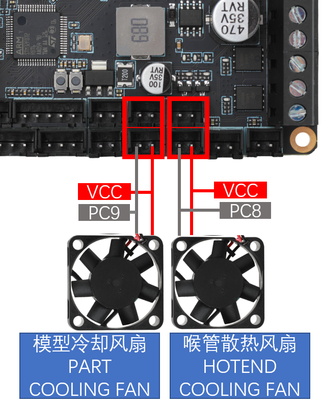 • 直流热床: 板载MOS接直流热床时请注意使用功率,直流热床最大电流不能超过10A。如果超过10A,建议使用外接MOS模块来使用热床,否则可能会对主板造成不可逆的损伤。