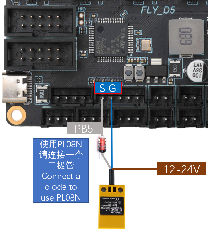 • VORON官方建议是使用欧姆龙Omron TL-Q5MC(之前官方推荐的是PL08N,两者原理一样,只是探测距离不一样)传感器来进行热床调平。接线方式如下图所示。