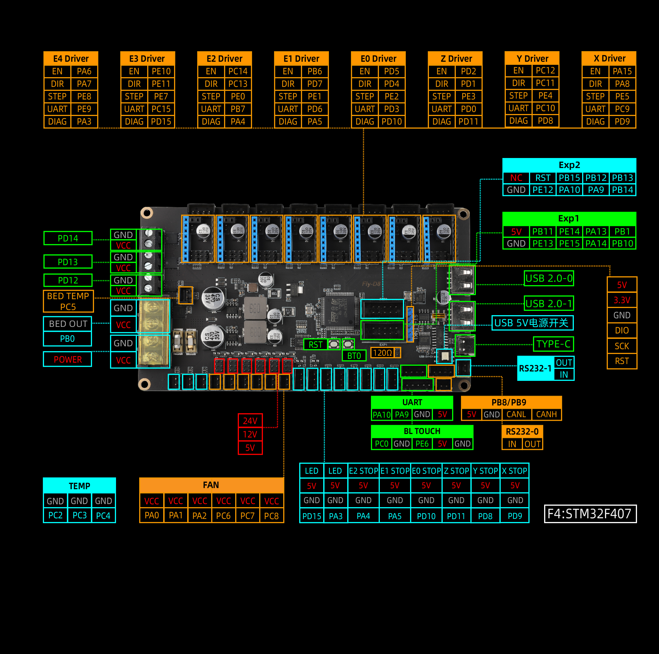 MotherboardFLY-D Series BoardsFLY-D8 (F407)主板接线PIN脚说明 注意事项由于图片分辨率太高,在网页上浏览无法看清,请将鼠标光标放在接线图上方,单击右键,将 图片另存为 到桌面再查看! 主板接线 注意事项正在制作