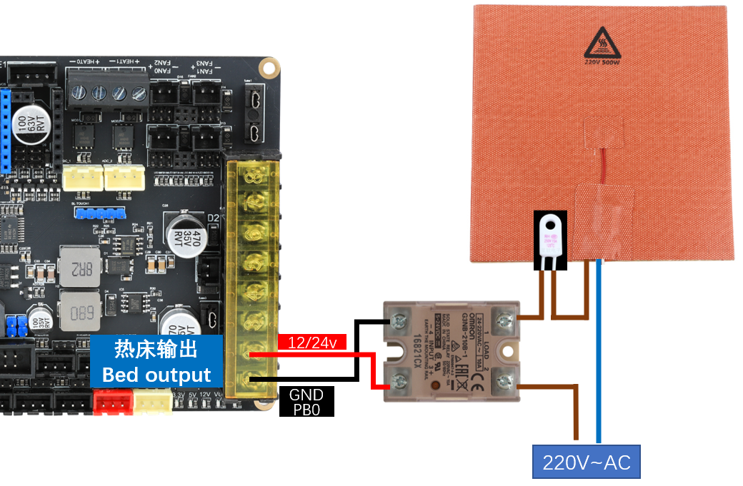 交流热床: 固态继电器在接线时,请注意输入和输出别接错了。