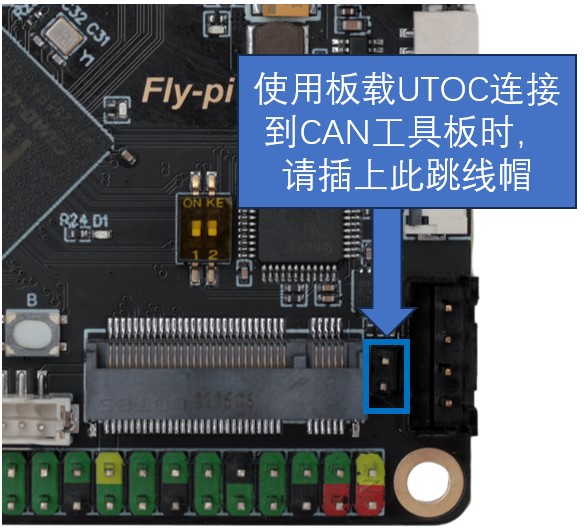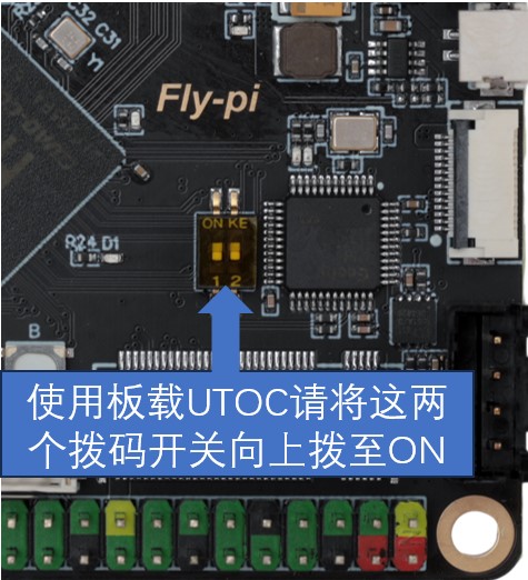 Host computerFLY-Pi-V2板载UTOC使用On this page板载UTOC使用 打开拨码 打开拨码后将占用一个USB口 tip使用拨码开关启用板载UTOC后,下图所示的USB口会被占用,不能再接入任何设备!!! 接线