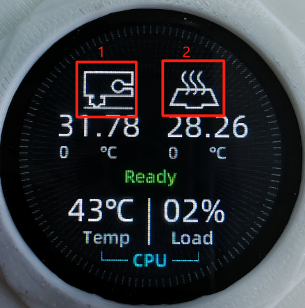 2. 单击:进入热床温度设置,通过拖动环形条来调整温度,再次单击区域2可确认设置温度