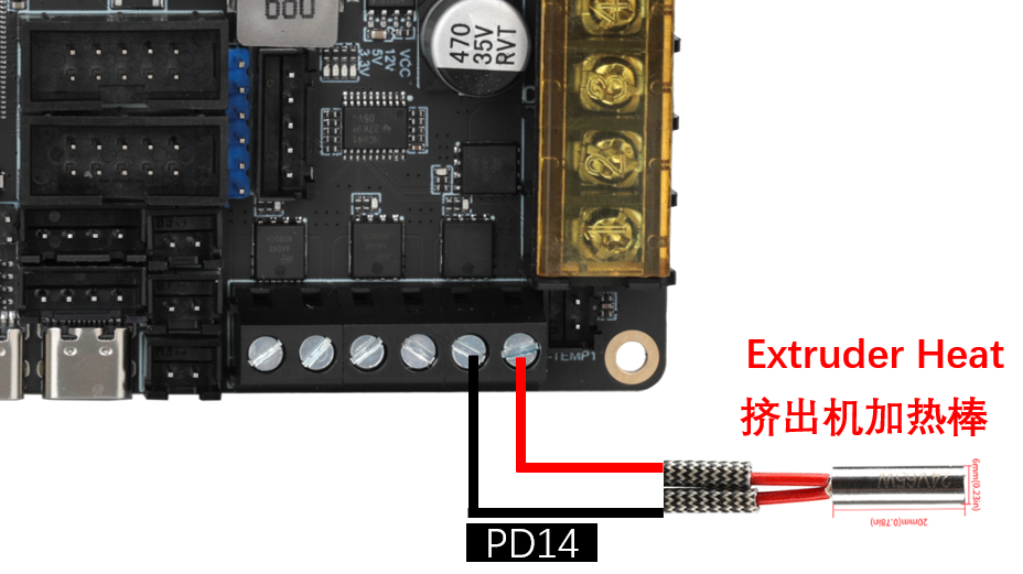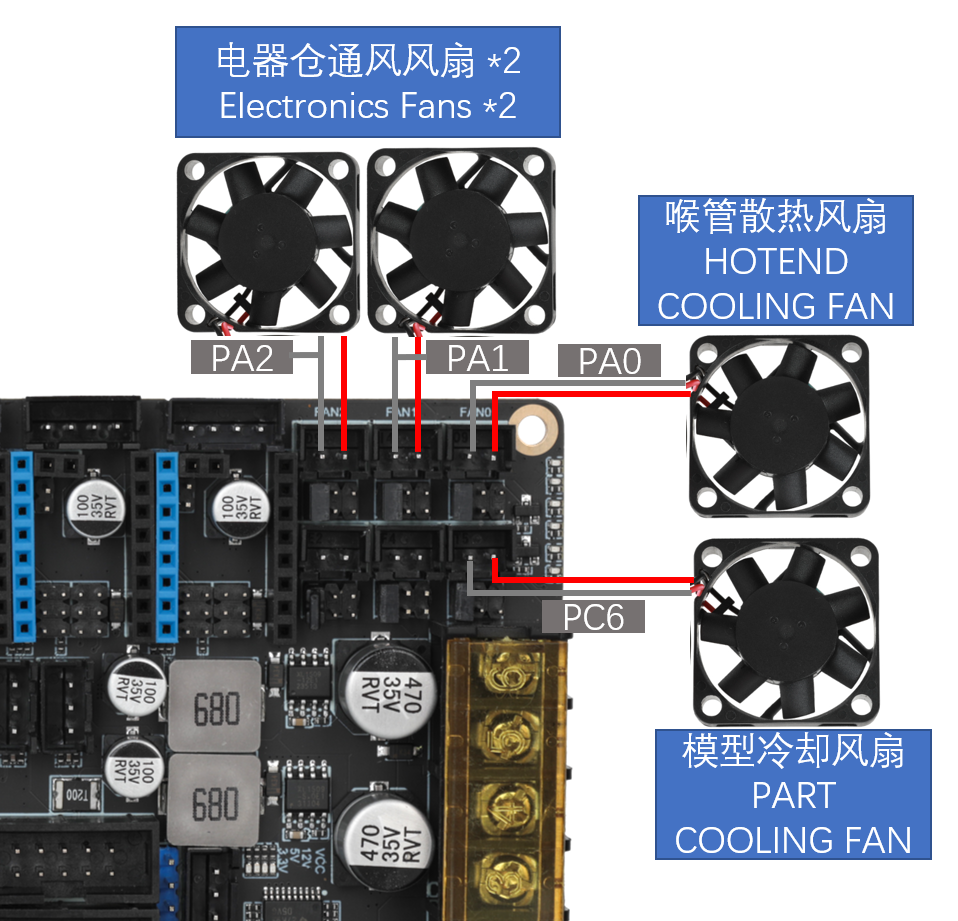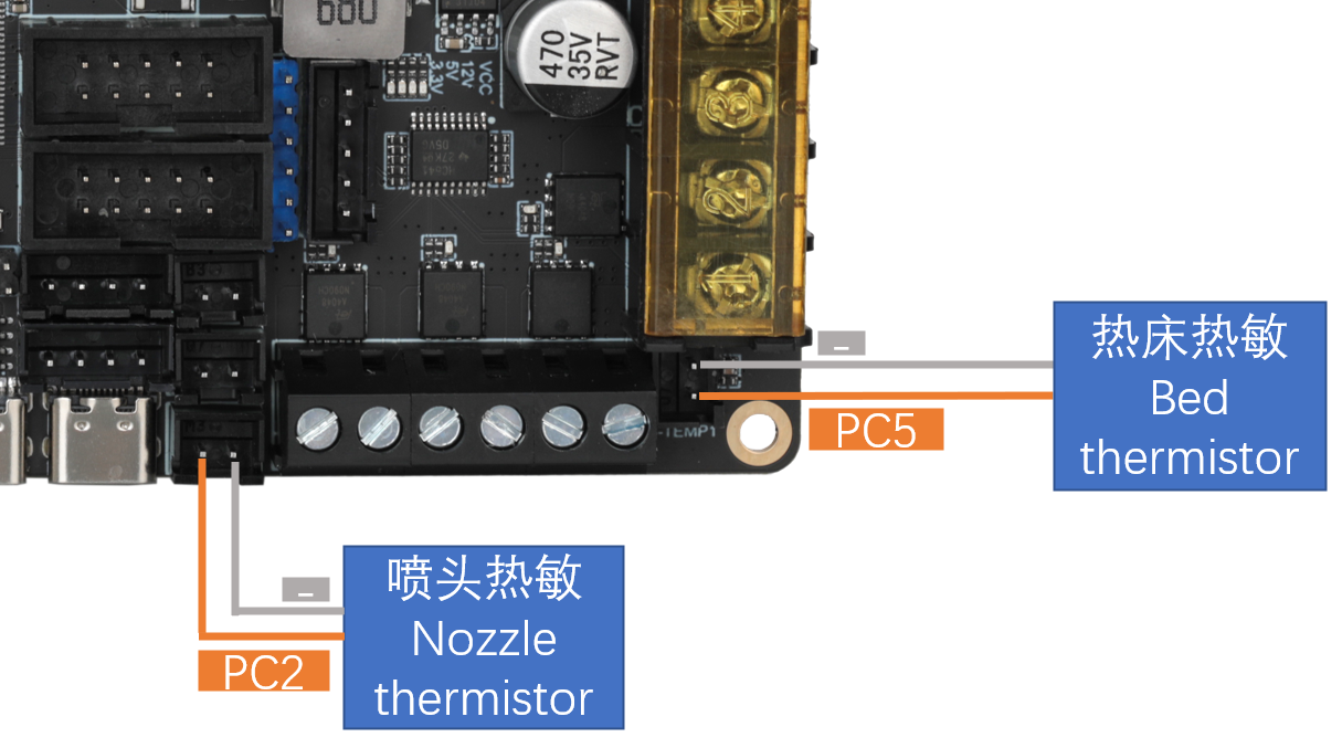 直流热床: 板载MOS接直流热床时请注意使用功率,直流热床最大电流不能超过10A。如果超过10A,建议使用外接MOS模块来使用热床,否则可能会对主板造成不可逆的损伤。