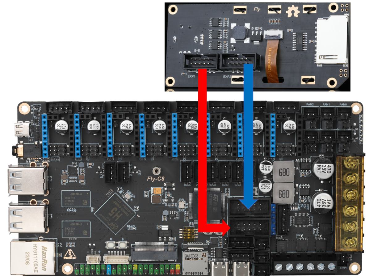 下图为FLY的mini12864的接线方式,其他厂家的屏幕请咨询相应厂家。Mini12864屏幕接接反,接错可能会导致上位机连不上MCU。如果使用mini12864屏幕之前可以正常连上主板的MCU,而使用mini12864后就连不上MCU了,请尝试拔出mini12864的接线!!!