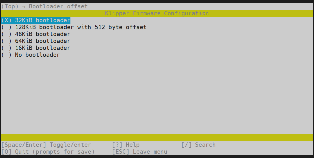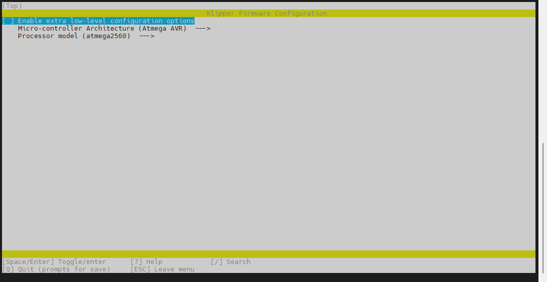• 其中 rm -rf ~/klipper/.config && rm -rf ~/klipper/out是删除之前编译数据与固件make menuconfig是编译固件,执行后应该出现下方界面