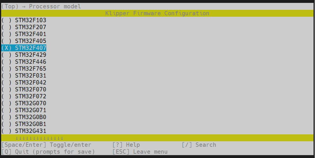 cd ~/klipper && rm -rf ~/klipper/.config && rm -rf ~/klipper/out && make menuconfig