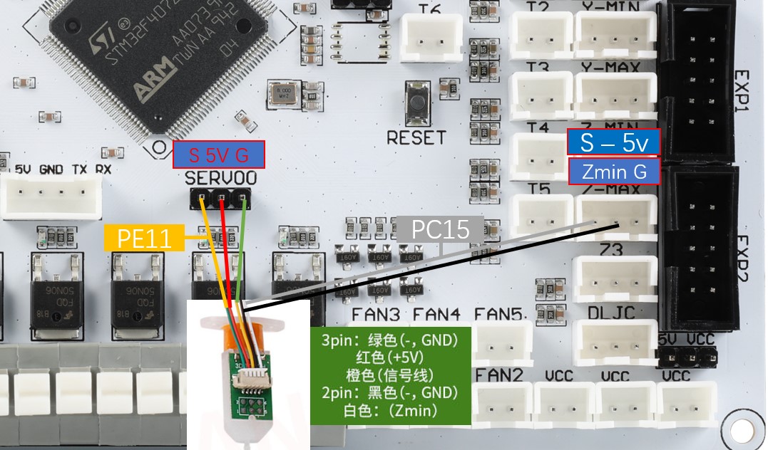BL-touch一共有五根线,三根为第一组,负责传感器的供电和探针的收放,第二组为地线和信号线,输出限位信号。BL-touch接线时请仔细核对线序,错误的接线可能会永久性损坏传感器和主板!!!接线方法如下图所示。