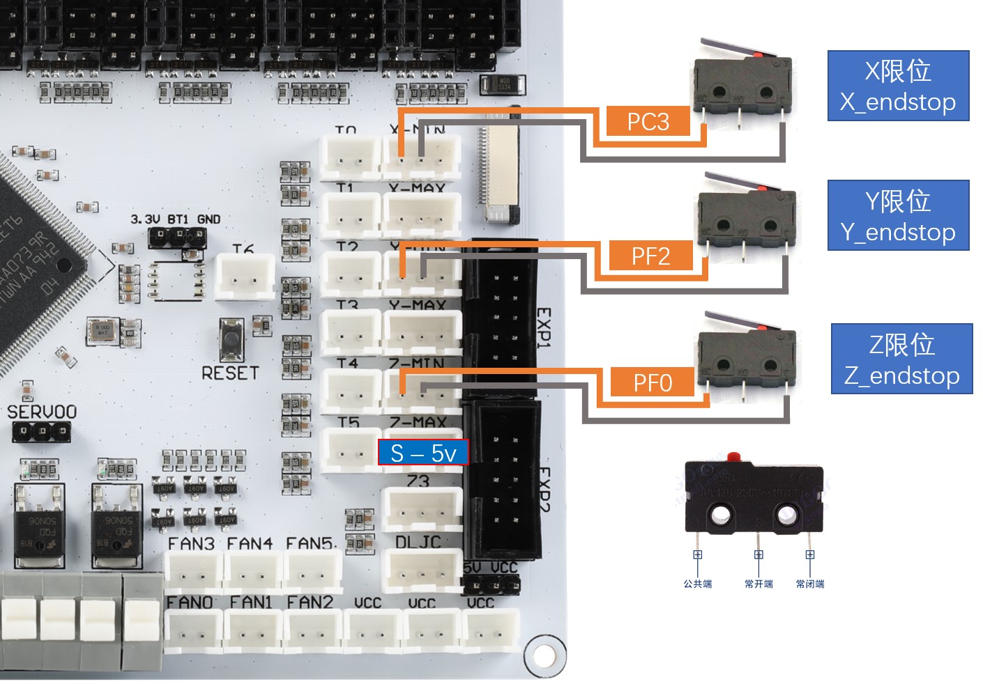 限位开关有常开(NO)和常闭(NC)两种。一般在3D打印机上,建议使用常闭(NC),这样在限位开关线路出现问题时,系统会及时报错,可以避免一些不必要的撞车,避免损坏打印机。