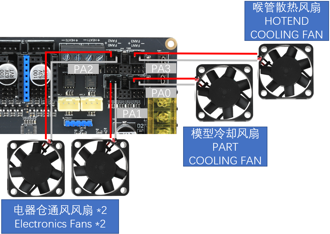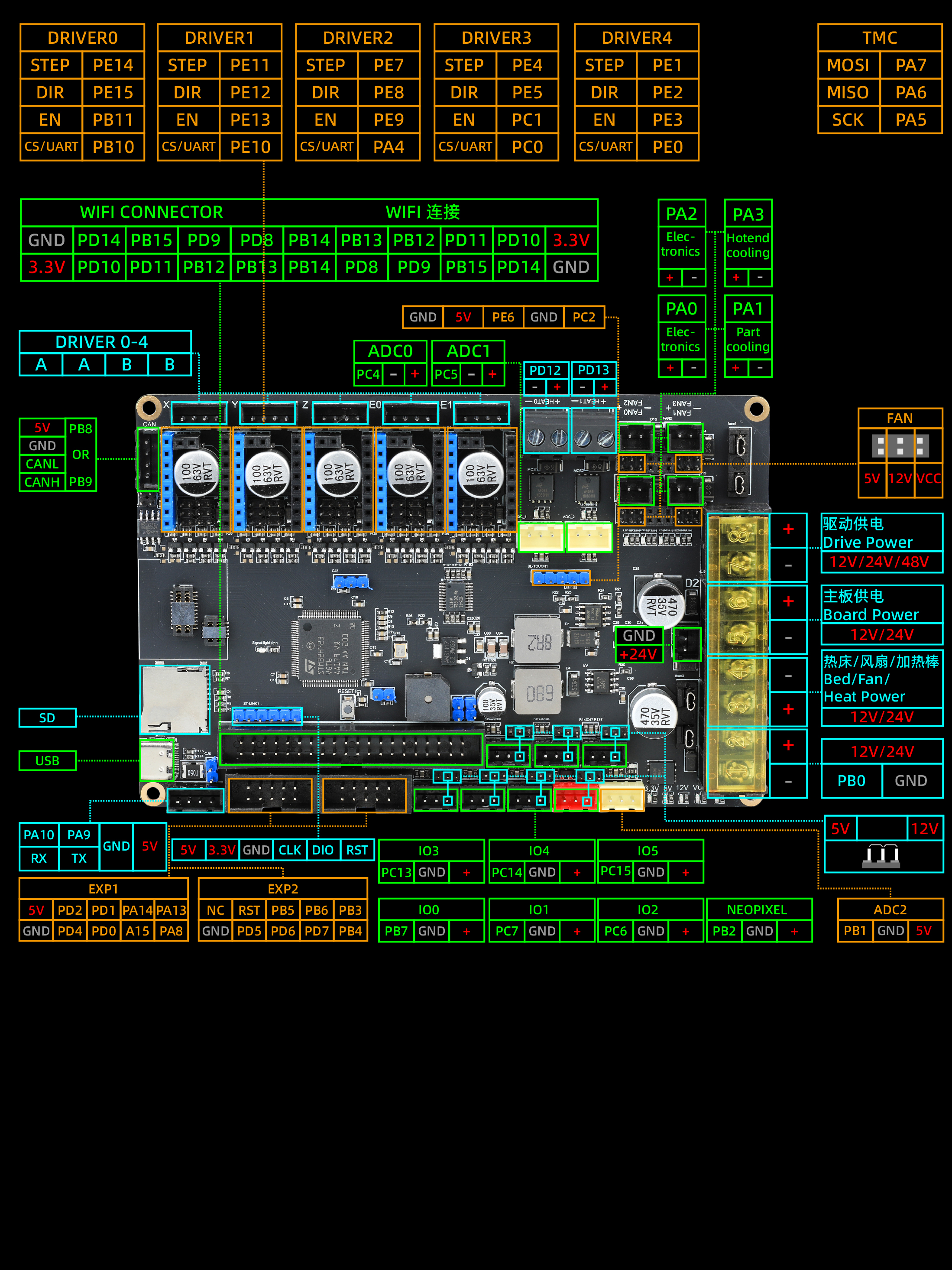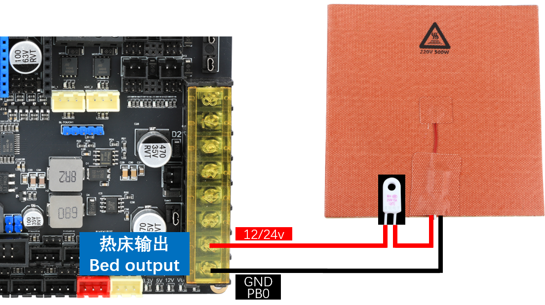 直流热床: 板载MOS接直流热床时请注意使用功率,直流热床最大电流不能超过10A。如果超过10A,建议使用外接MOS模块来使用热床,否则可能会对主板造成不可逆的损伤。
