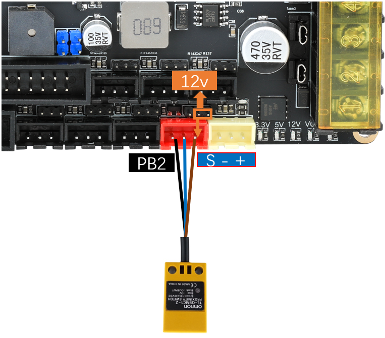 VORON官方建议是使用欧姆龙Omron TL-Q5MC(之前官方推荐的是PL08N,两者原理一样,只是探测距离不一样)传感器来进行热床调平。接线方式如下图所示。