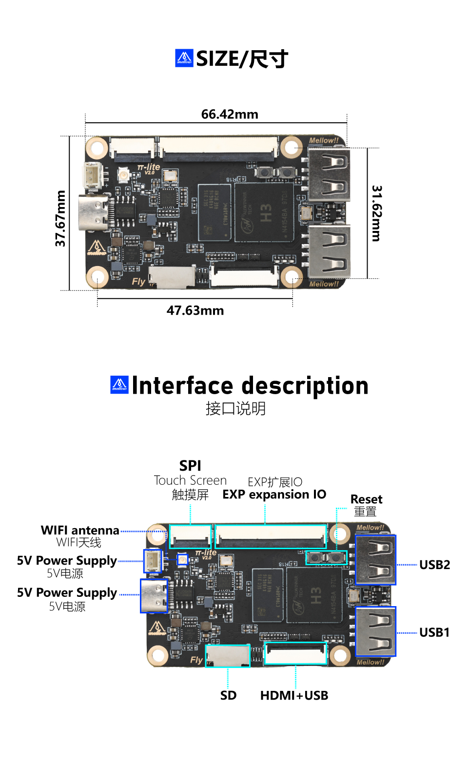 上位机类FLY-Lite 2简介Sur cette page简介 Fly-Pi-lite2是一款入门级Klipper上位机 特点 CPU:高性能全志H3芯片,4核64位Cortex-A7 GPU:Mali-400 MP2 RAM:512MB DDR3 ROM:支持最大128GB SDCARD WIFI : 板载2.4G WiFi 外设:Spi x1,URAT x2, USB x2,HDMI x1 接口:预留FPC,HDMI + USB FPC一线通 为Klipper定制的系统,无需安装系统等复杂的操作,小白更容易上手 产品接口说明