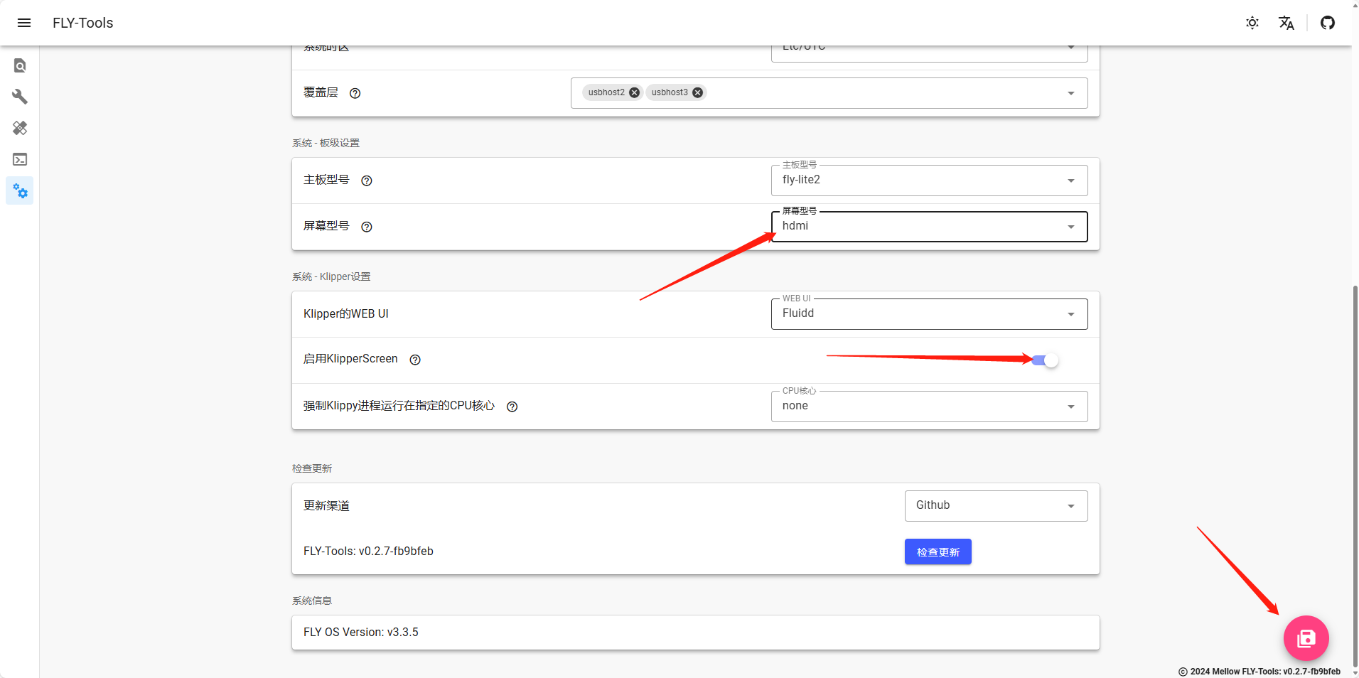 • 需要在FLY TOOLS中按下方配置屏幕并且打开KS