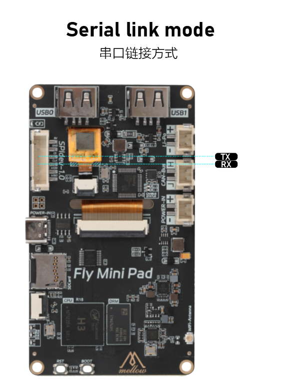 上位机类FLY-MINI Pad通过UART连接主板Sur cette page配置方法 须知请注意使用此方法后无法在使用mini pad的加速度接口外接加速度计 打开BOOT盘找到armbianEnv.txt并且打开 将overlays=usbhost2 usbhost3 uart2中的uart2修改成uart3保存即可 接线方法 请注意mini-pad的TX要接刷了串口固件主板的RX 请注意mini-pad的RX要接刷了串口固件主板的TX 请注意需要共地 否则无法连接刷了串口固件的主板 Klipper参考配置 [mcu]serial: /dev/ttyS3baud:250000# 使用的波特率。默认是250000restart_method:command