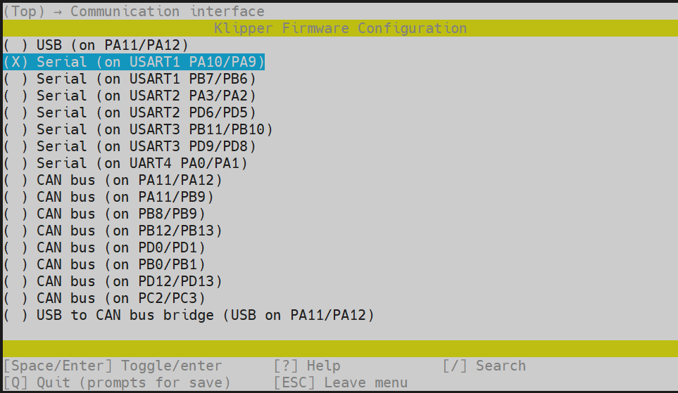 cd ~/klipper && rm -rf ~/klipper/.config && rm -rf ~/klipper/out && make menuconfig