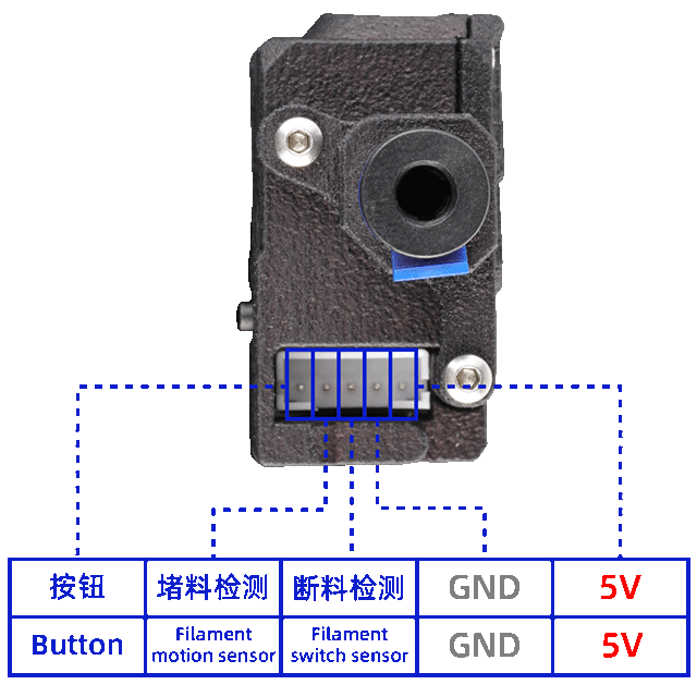 模块 & 扩展板类FLY-FilGuard-断堵料传感器产品简介このページの見出し产品简介 FilGuard Filament detector兼容VZ-Hextrudort-Low挤出机,支持断料检测,堵料检测,并且带可自定义编辑的按钮。 接线教程 板载PH2.0 5P端子接线更方便 固件灯状态介绍 缺料:红色爆闪 进料:蓝色闪烁(进料速度越快,闪烁频率越高) 退料:绿色闪烁(同上) 有料但是没有进退料:橙色呼吸灯 klipper,断料与堵料参考配置