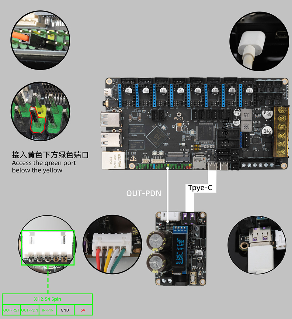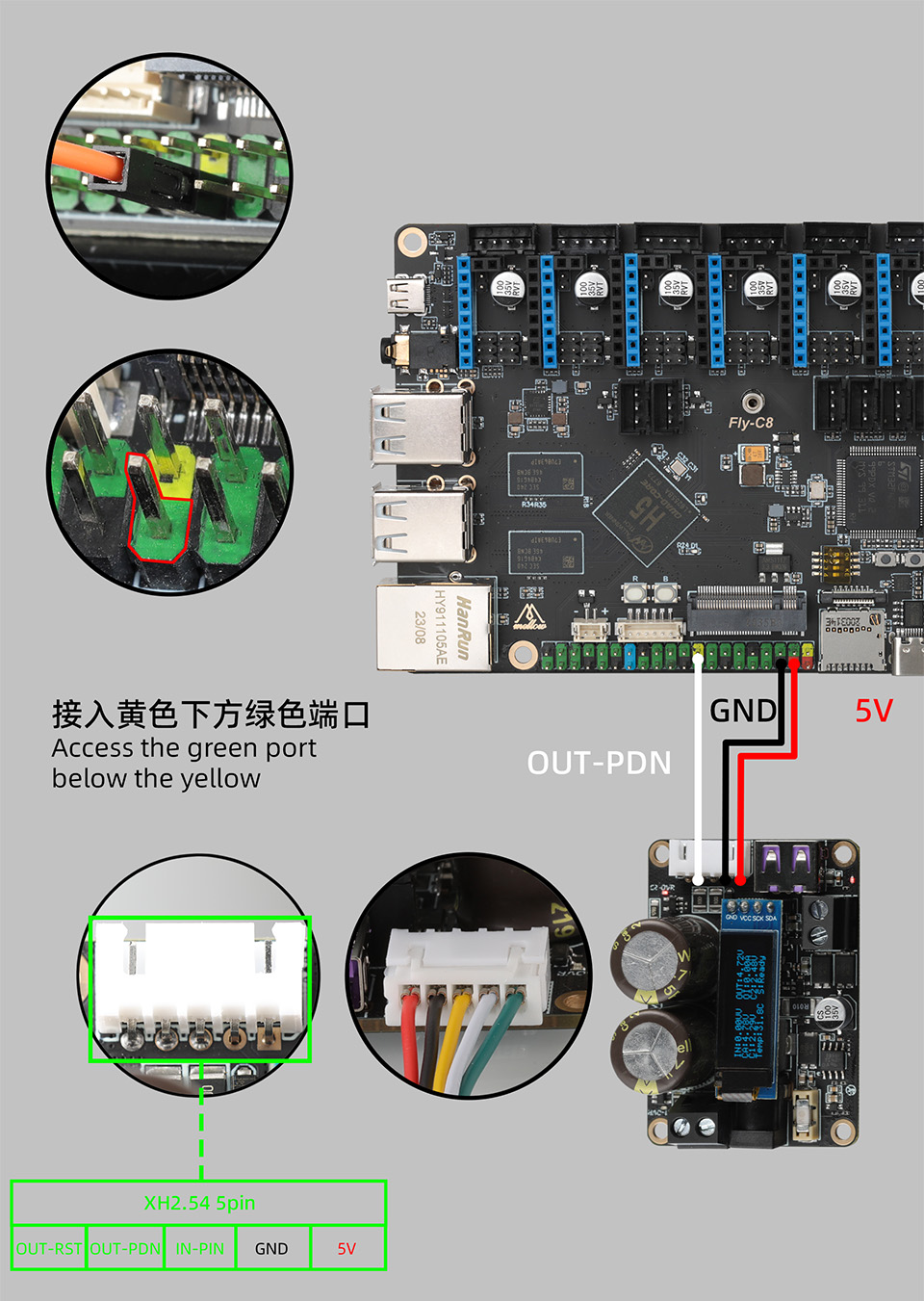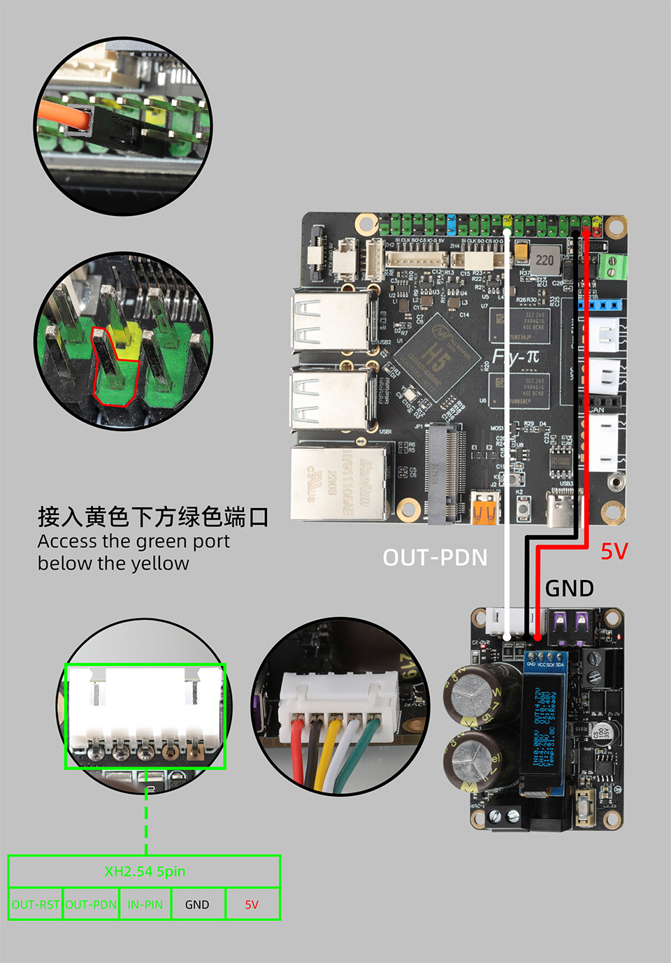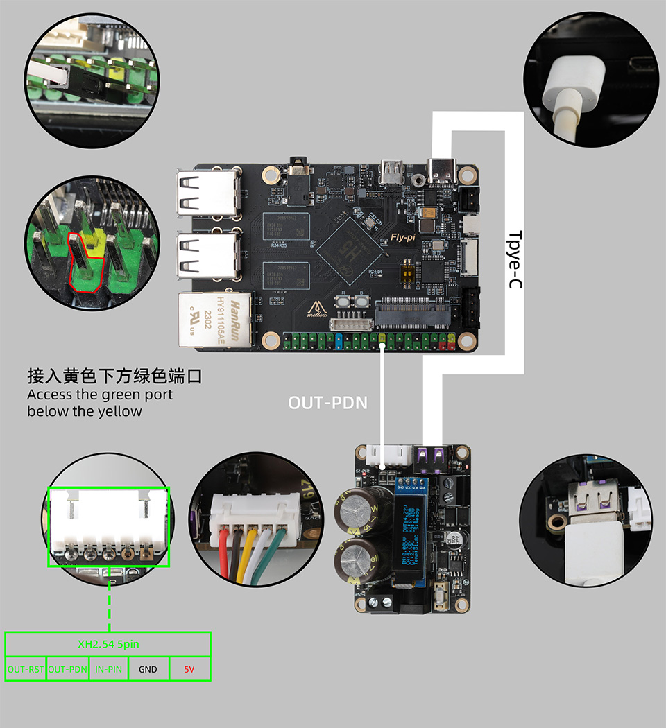搭配安全关机模块时候,需要使用 12V-24V 电源供电,为确保模块工作正常,安全关机模块板内 5V 输出电压不能低于 4.9V,否则 安全关机模块 会从内部升压取电,电容会一直处于充电状态,导致模块持续发热