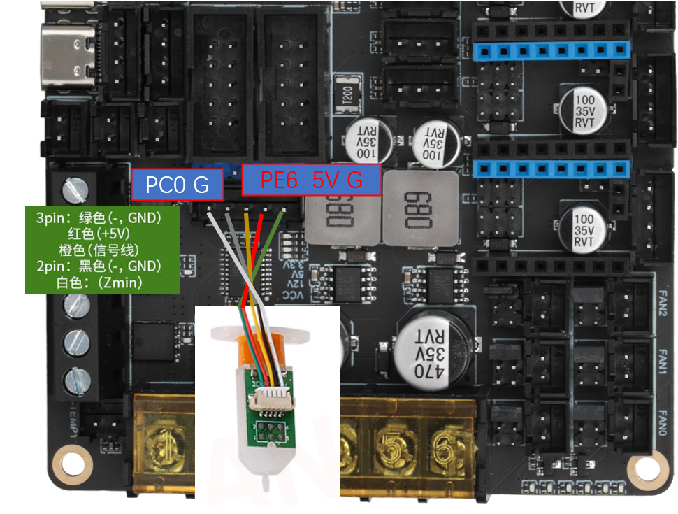 • Klicky为第三方的调平传感器,能够用极低的成本自己在家制作,且性能稳定,性价比高,推荐使用。接线方法如下图所示。