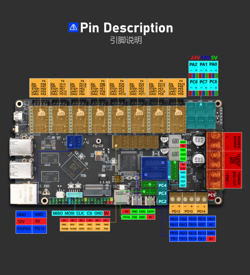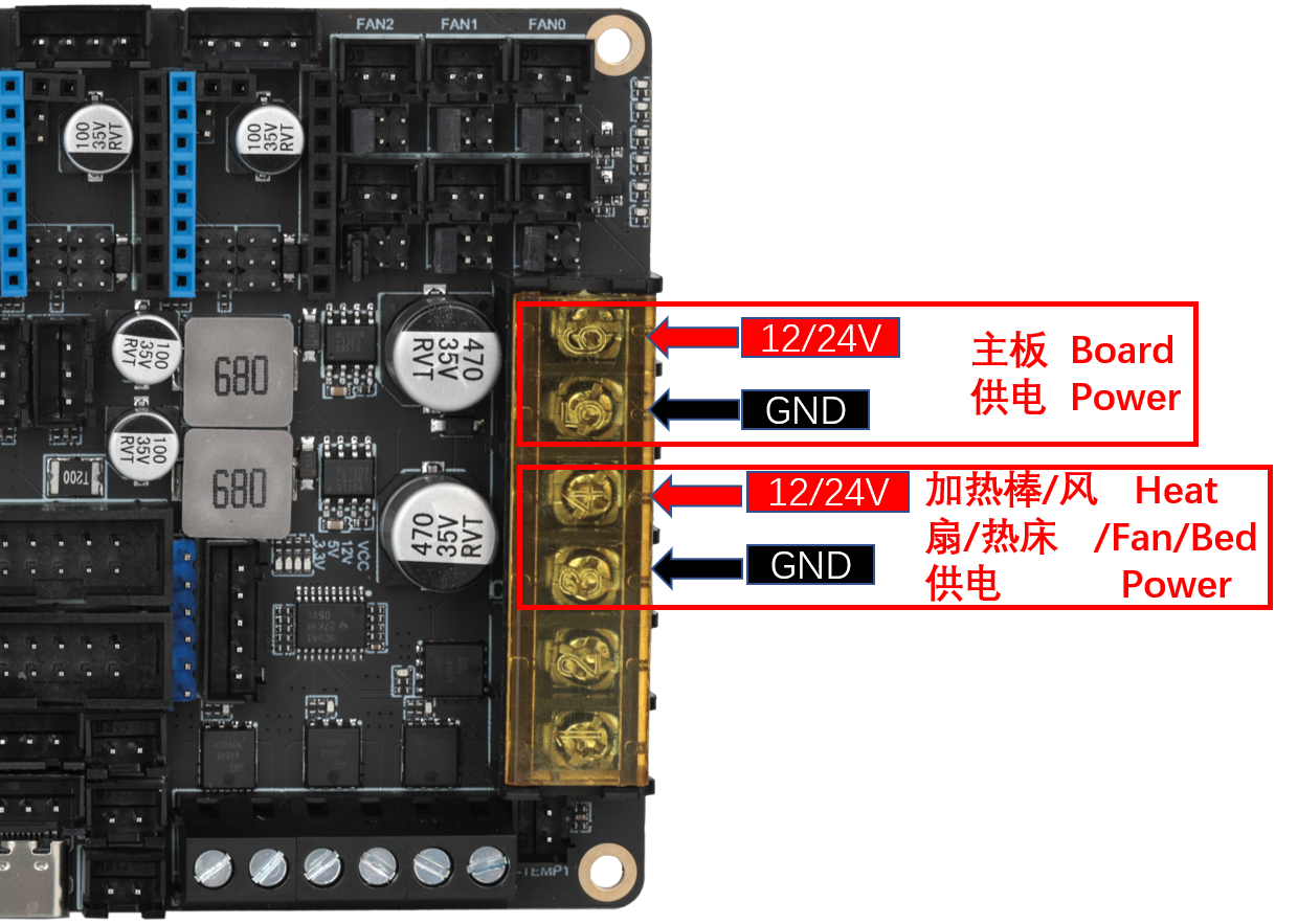• 直流热床: 板载MOS接直流热床时请注意使用功率,直流热床最大电流不能超过10A。如果超过10A,建议使用外接MOS模块来使用热床,否则可能会对主板造成不可逆的损伤。