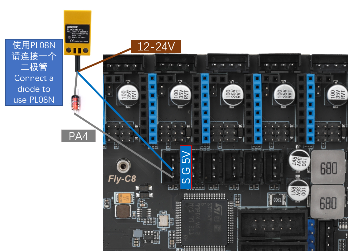 • VORON官方建议是使用欧姆龙Omron TL-Q5MC(之前官方推荐的是PL08N,两者原理一样,只是探测距离不一样)传感器来进行热床调平。接线方式如下图所示。