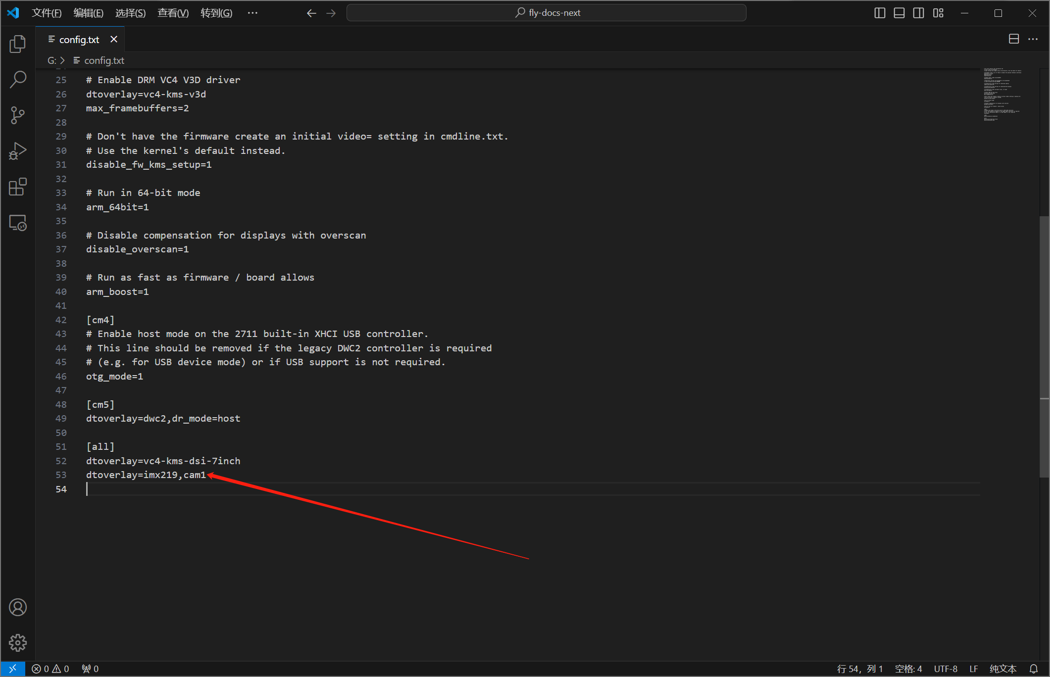 • 镜像烧写完成后,进入/boot/config.txt中找到camera_auto_detect=1并且修改成camera_auto_detect=0然后按着摄像头型号添加配置