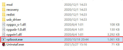 - 以安装驱动程序和启动工具。安装成功之后在安装目录下有一个rpiboot.exe的应用