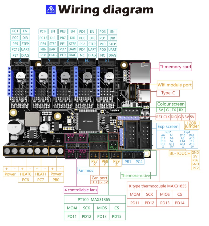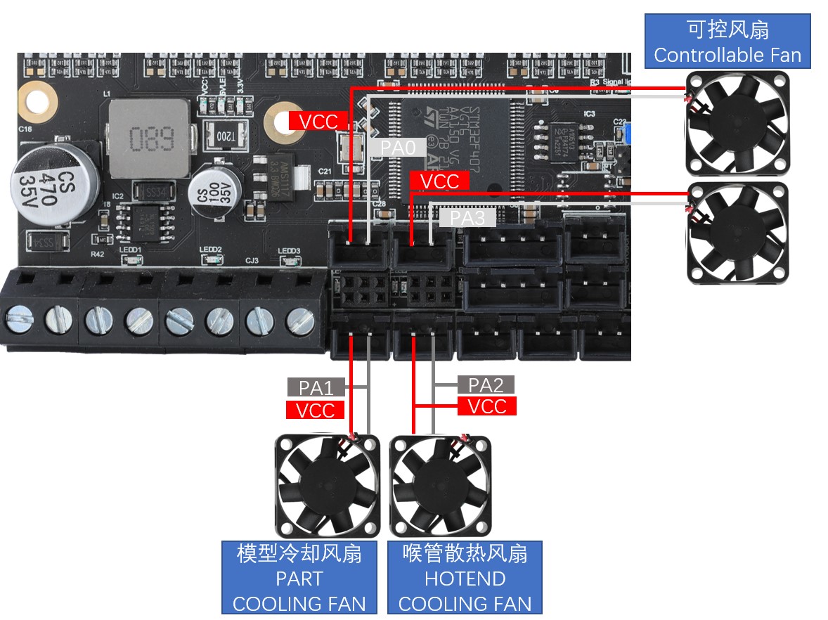 • 直流热床: 板载MOS接直流热床时请注意使用功率,直流热床最大电流不能超过10A。如果超过10A,建议使用外接MOS模块来使用热床,否则可能会对主板造成不可逆的损伤。