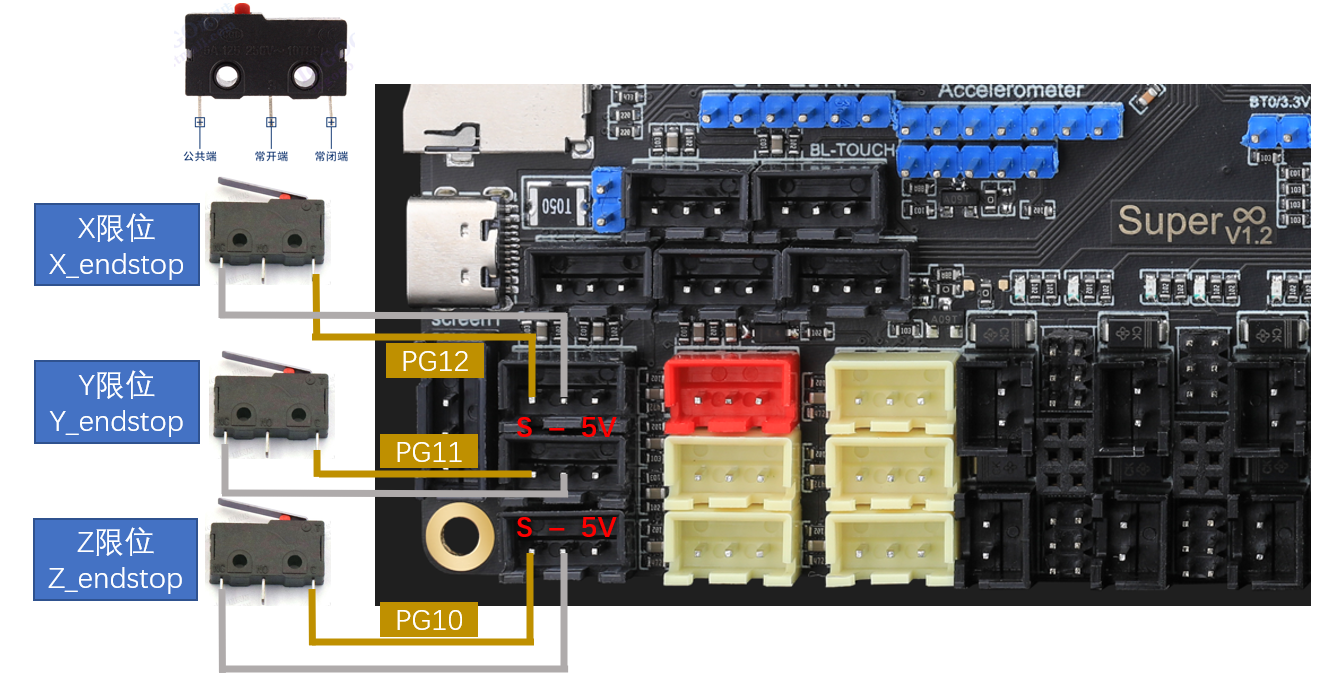 • 限位开关有常开(NO)和常闭(NC)两种。一般在3D打印机上,建议使用常闭(NC),这样在限位开关线路出现问题时,系统会及时报错,可以避免一些不必要的撞车,避免损坏打印机。