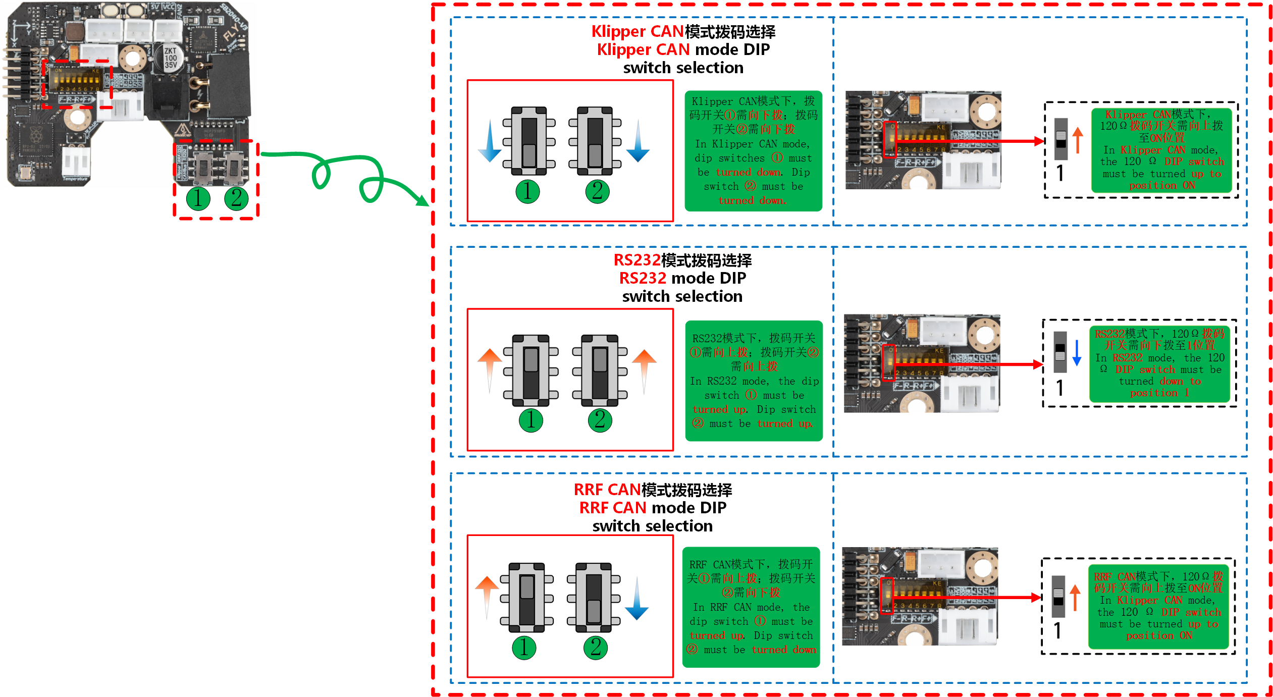 工具板类FLY-SB2040系列FLY-SB2040-PRO-V3板载拨码介绍Содержание этой страницы板载拨码介绍 注意事项由于图片分辨率太高,在网页上浏览无法看清,请将鼠标光标放在接线图上方,单击右键,选择 图片另存为 ,将图片保存到桌面再查看!!! 工作模式选择 注意事项请注意SB2040 PRO V3支持三种连接方式,需要修改拨码并且烧录固件才可以正常连接 31865拨码选择 请注意拨码默认朝下