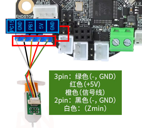 Klicky 为第三方的调平传感器,能够用极低的成本自己在家制作,且性能稳定,性价比最高,推荐使用。接线方法如下图所示。